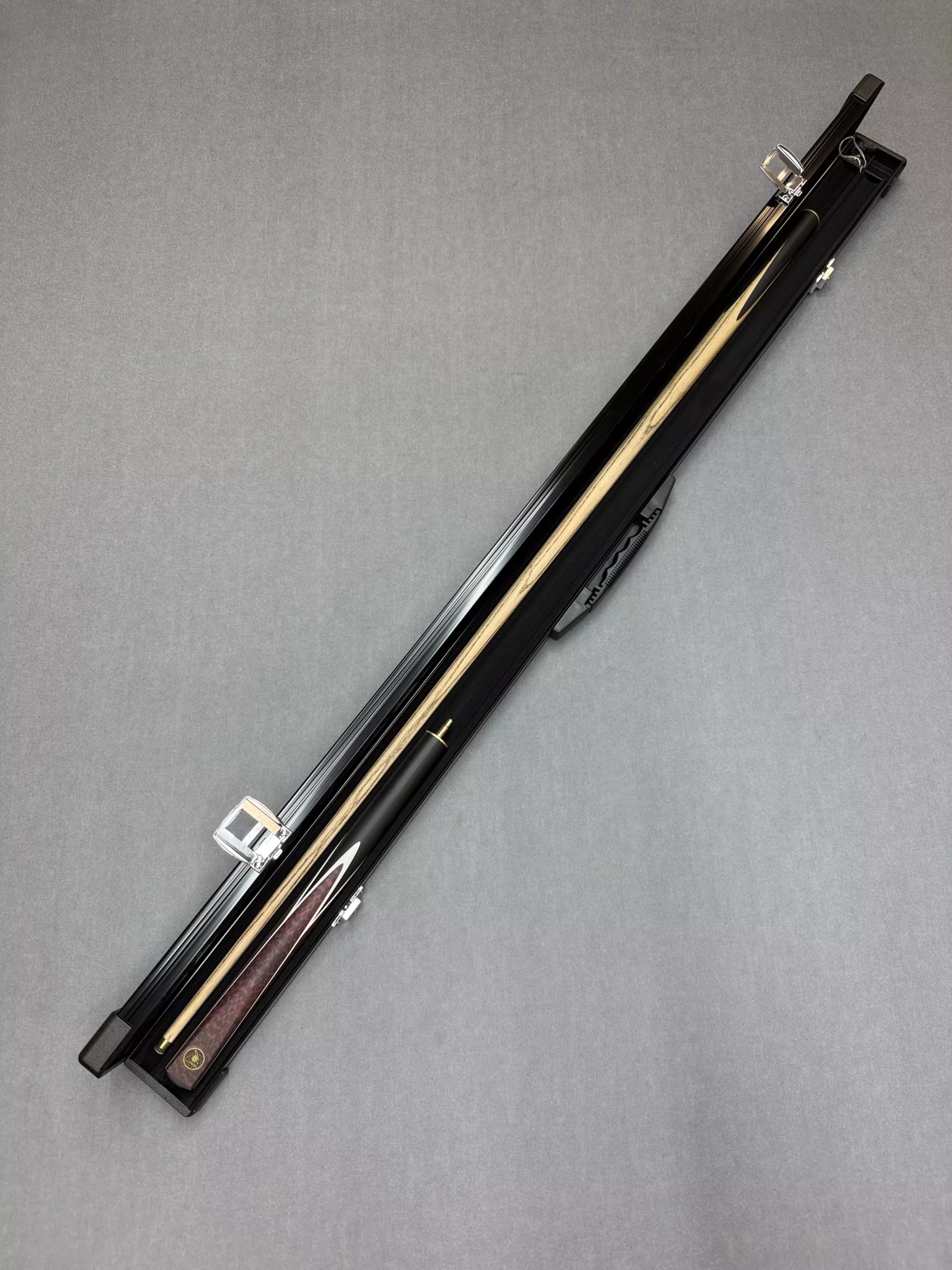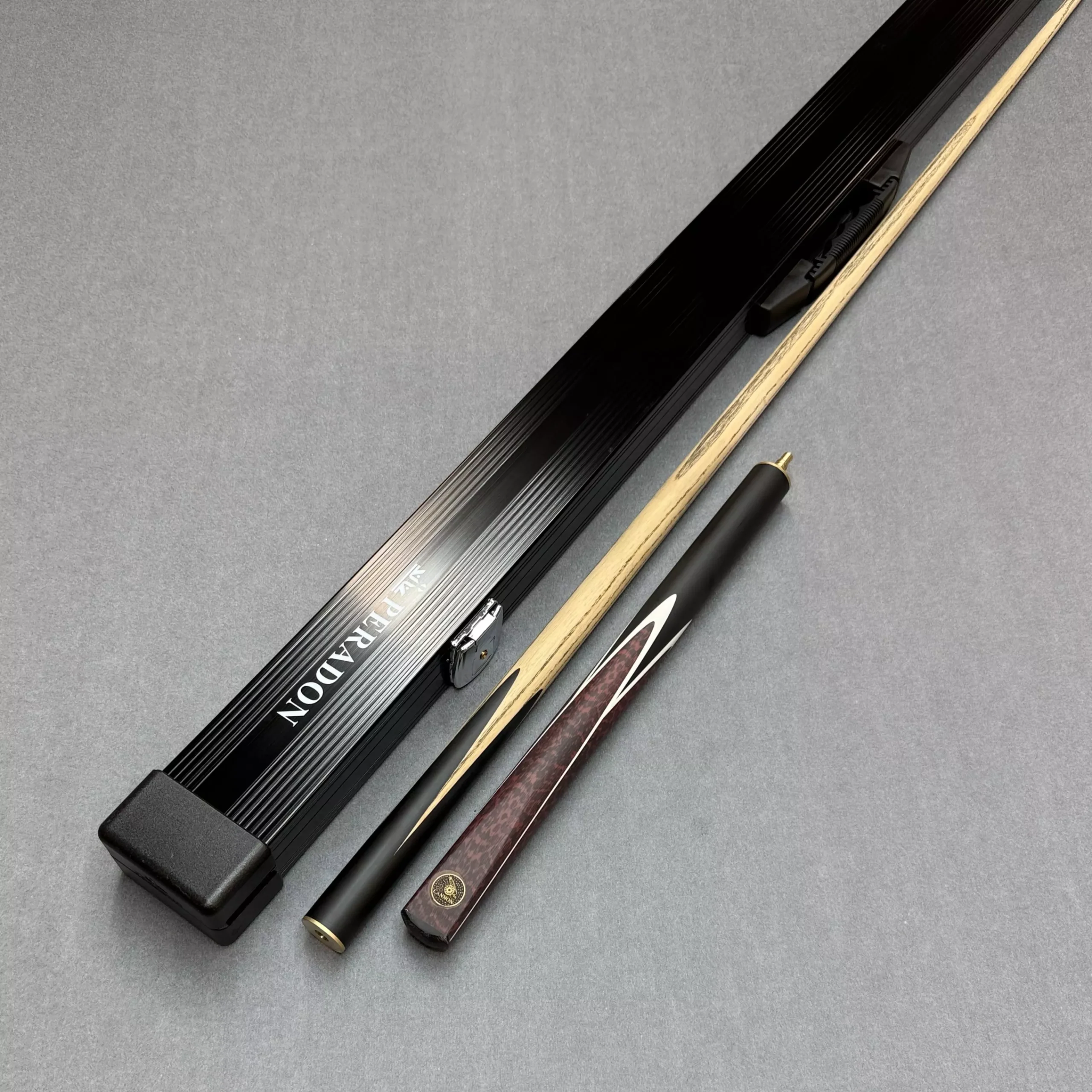 This 57” ¾ jointed Peradon snooker cue is manufactured from sports-grade ash and offers superb value for money. The cue features a simulated hand-spliced Ebony butt decorated with four decals of Snakewood with White veneers. The brass ‘Cannon’ joint is fitted 14” from the butt of the cue.