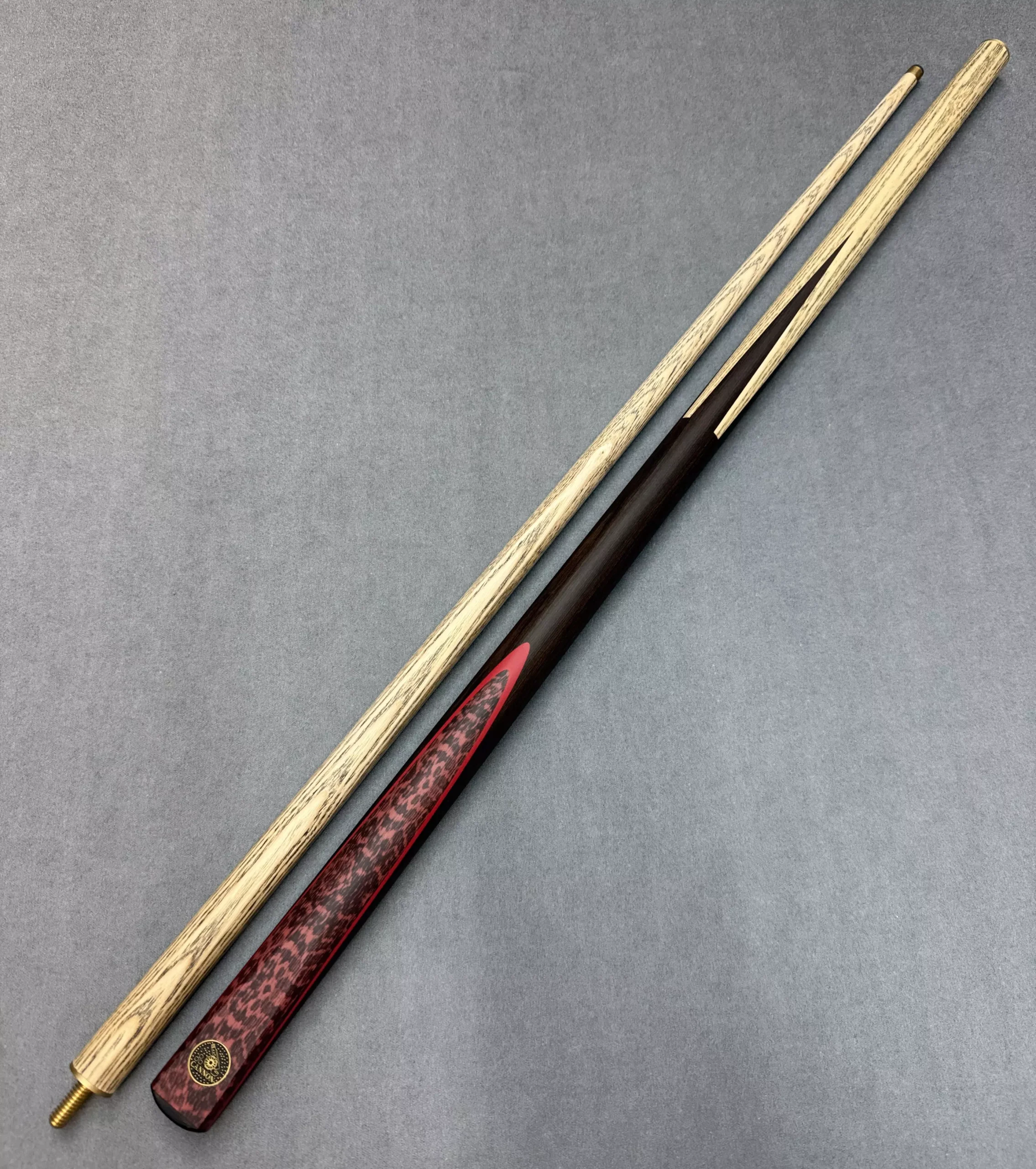 This 57” two piece snooker cue is manufactured from sports grade Ash offer superb value for money. The cue features a machine-spliced Rosewood butt decorated with a decal of Snakewood with a Red veneer. The brass ‘Cannon’ joint is fitted in the centre of the cue.