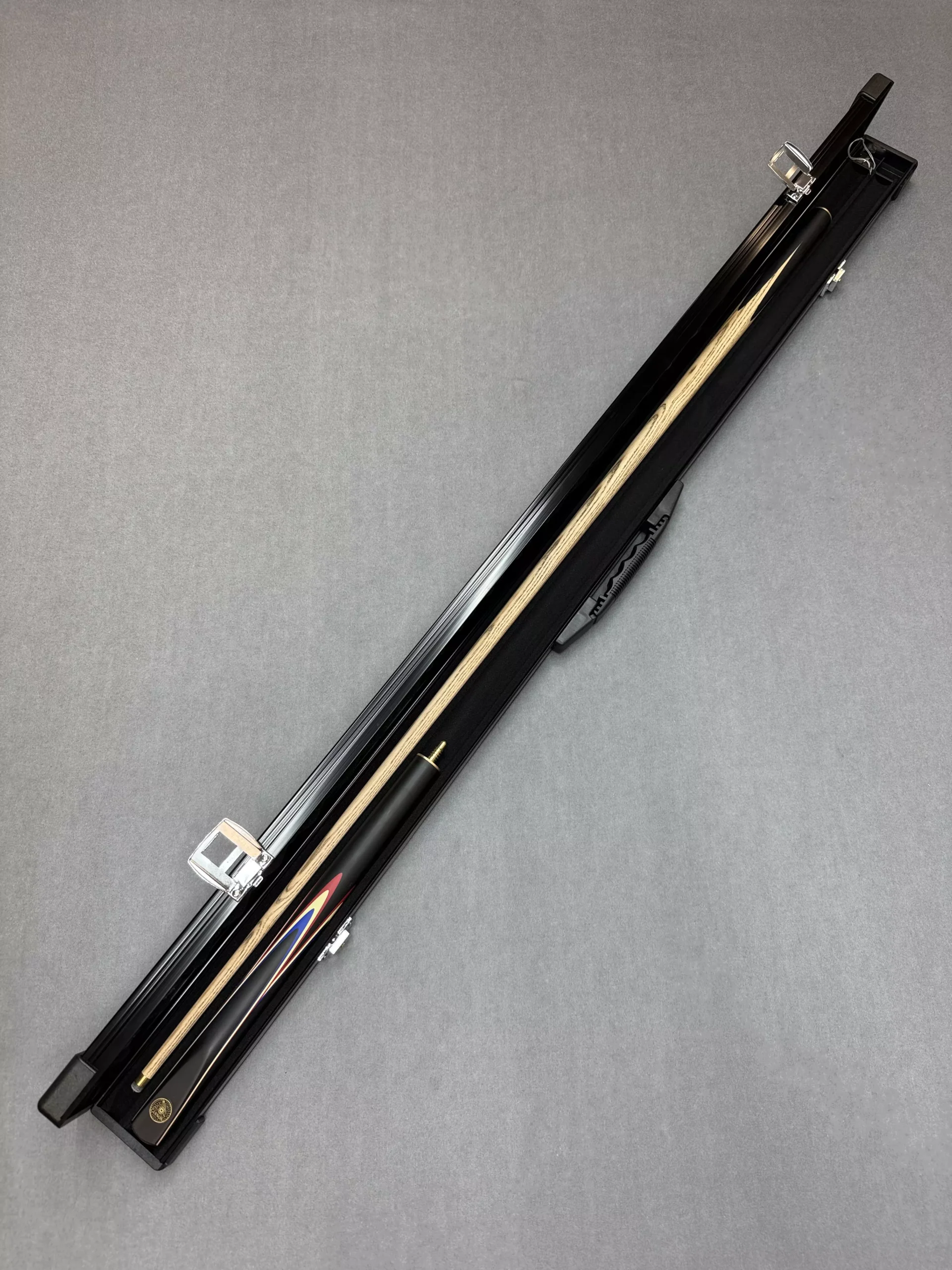 This 57” ¾ jointed cue is manufactured from sports-grade ash and offers superb value for money. The snooker cue features a simulated hand-spliced Ebony butt decorated with four ebony decals, complemented by red, white, and blue veneers.