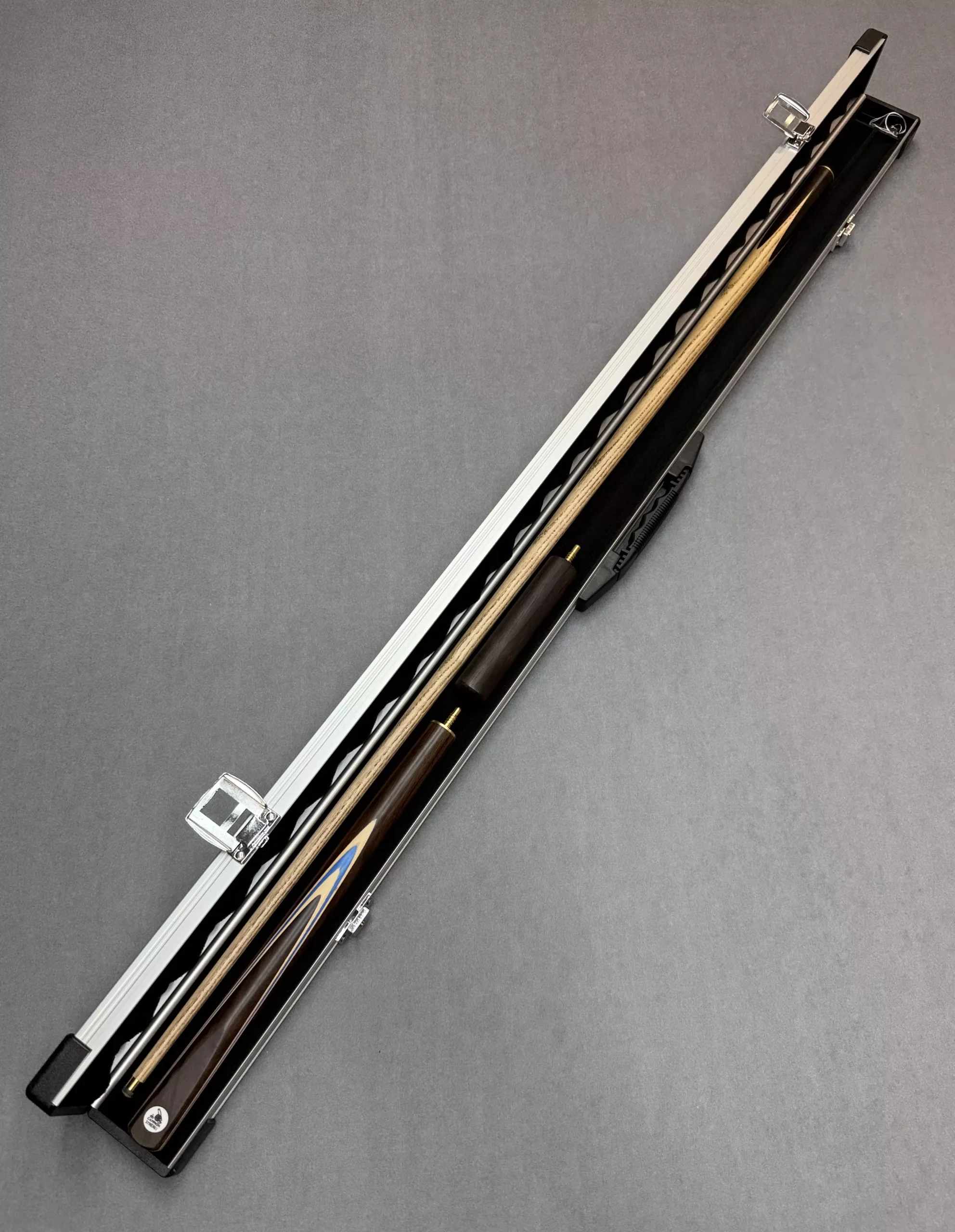 This 57” ¾ jointed cue is manufactured from sports-grade ash, which is further selected to offer superb value for money. The genuine rosewood butt is hand-spliced to the ash shaft, and a rosewood front splice with two sycamore veneers and one blue veneer is then spliced to the butt section to enhance the appearance further. The brass ‘Cannon’ joint is fitted 14” from the butt of the cue.