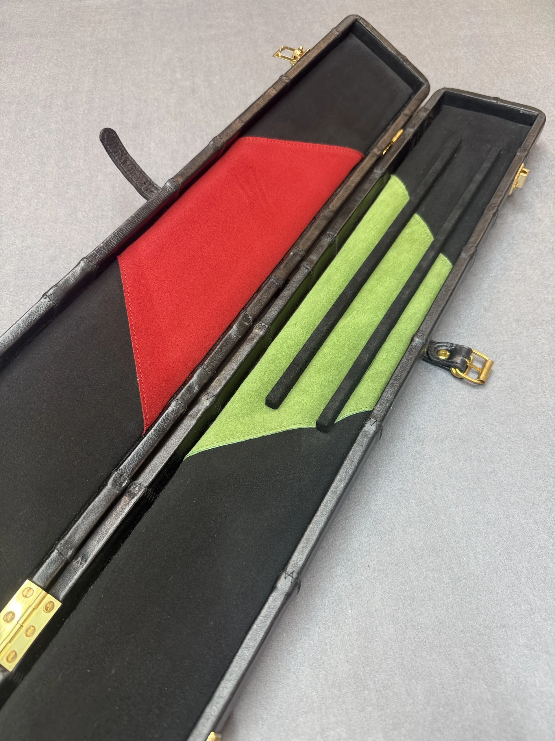 They are constructed as a wooden case, which is then beautifully upholstered with the finest quality leather on the exterior and with sued leather on the padded interior, which holds the cue in place. The smooth, rounded leather case ends are a testament to the skill of the case maker. The solid brass hinges and catches are of the highest quality, as are the leather straps and buckles. The interior compartments of this case have been cleverly thought out to be much more versatile than most other cases whilst keeping the length to a minimum.