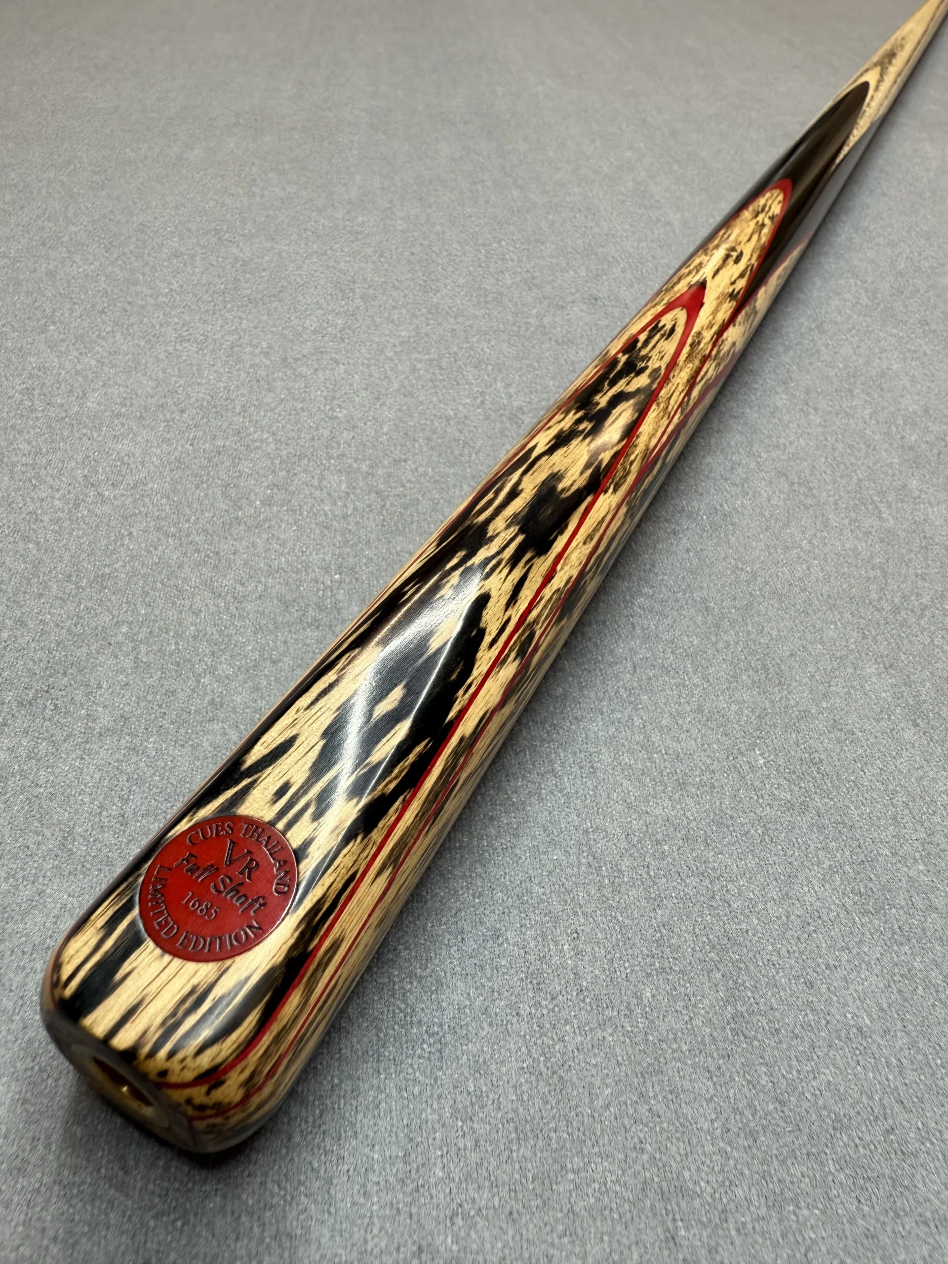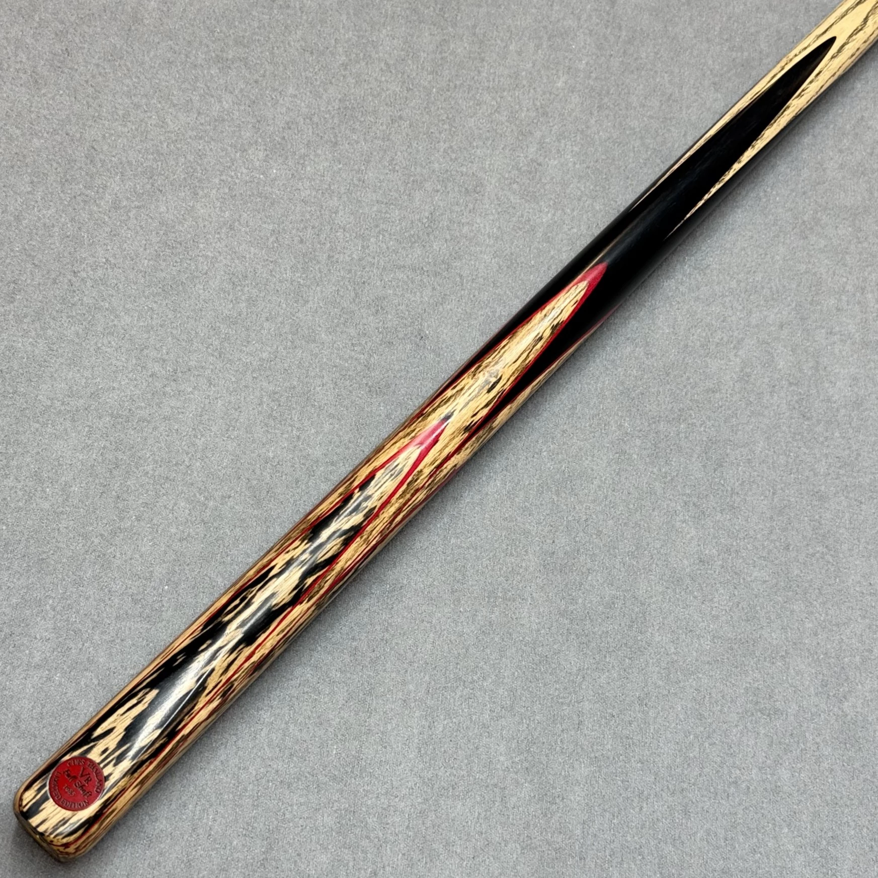 All VR Cues are fitted with an end joint for use with extensions (spiral thread). Each cue has a carefully selected shaft that includes straight side grain with forward-facing chevrons. Keen attention to detail ensures these all line up with the chamfer and badge. A blend of natural oils and waxes is applied to each range to finish the cue off.